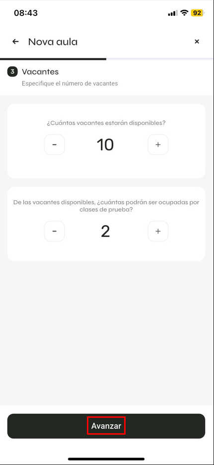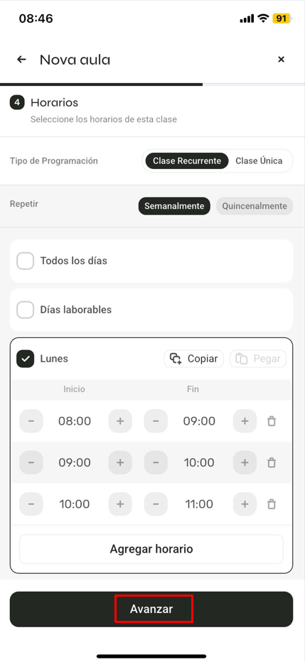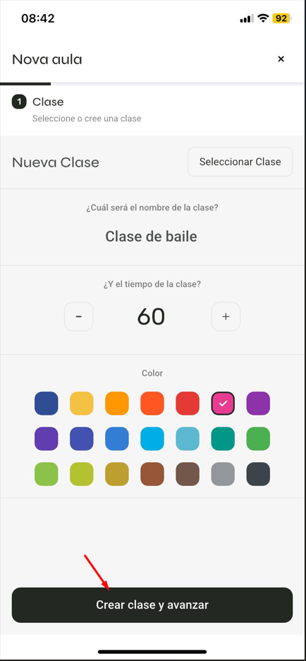 Define el nombre de la clase > duración de la clase > color > haz clic en 'Crear clase y avanzar'