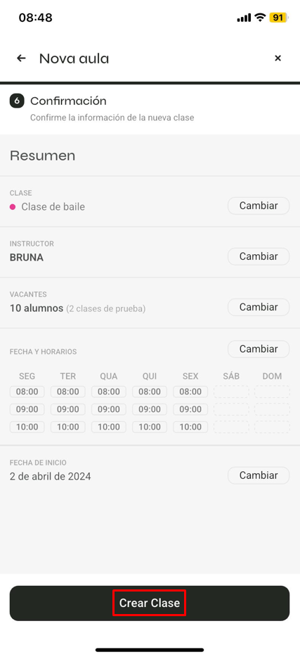 Por último, revisa el resumen de confirmación de clases y haz clic en 'Crear Clase':