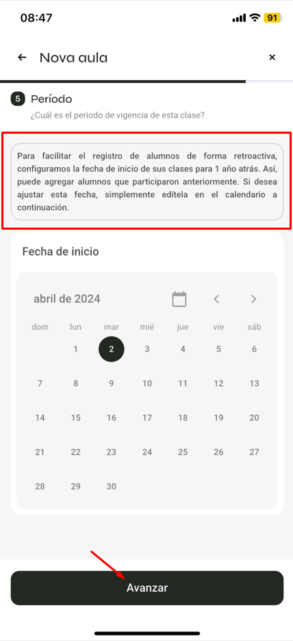 Determine la fecha de inicio de las clases, de forma predeterminada, el sistema crea la agenda con fecha retroactiva de un año.