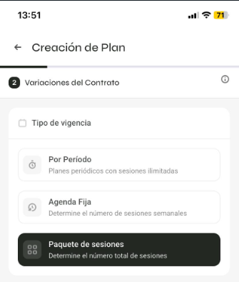 Configure el tipo de vigencia del contrato como 'Paquete de Sesiones':