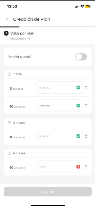 Determina el número de sesiones del plan, puedes seleccionar varias opciones: