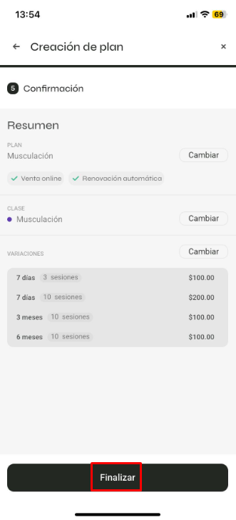 Valide el resumen del plan y haga clic en 'Finalizar':
