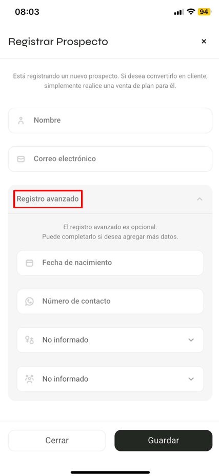En caso de querer un registro completo, llene el campo 'Registro avanzado':