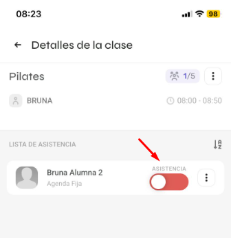 El círculo se pone rojo marcando la ausencia.¡Listo! ¡La asistencia o ausencia del alumno ha sido registrada con éxito!