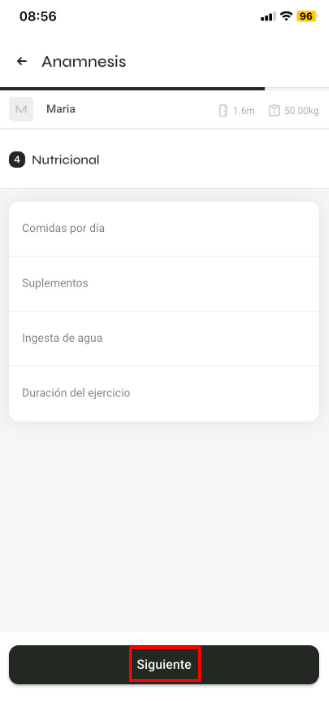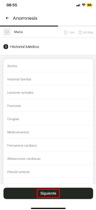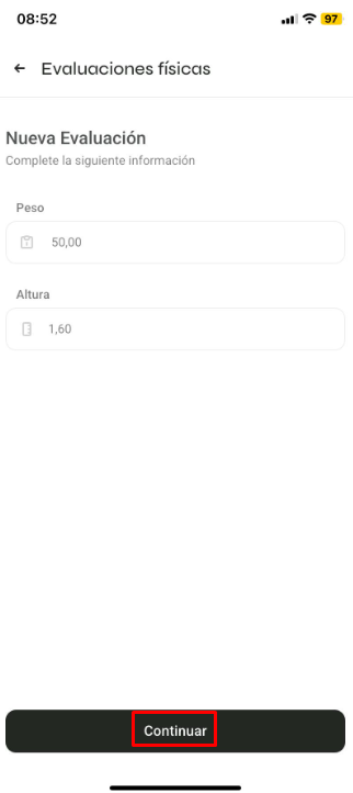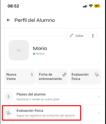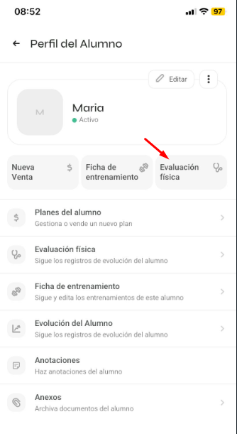 También puedes hacer clic en 'Evaluación Física', donde podrás analizar evaluaciones anteriores y registrar nuevas: