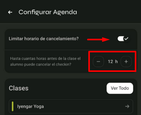 De esta forma, podrás definir cuántas horas antes de la clase el alumno podrá cancelar su check-in.