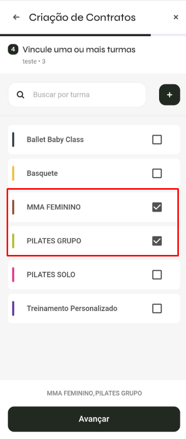 - Escolha as turmas que os alunos podem acessar ao adquirir esse contrato: