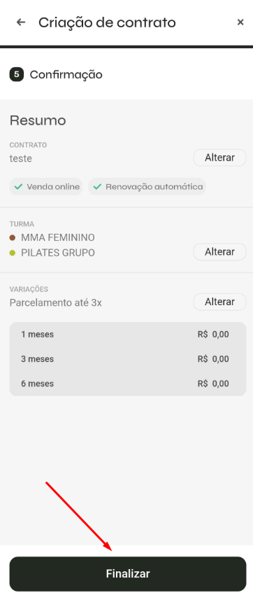 - Valide o resumo do contrato e clique em Finalizar: