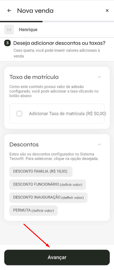 - Selecione taxa de matrícula e desconto