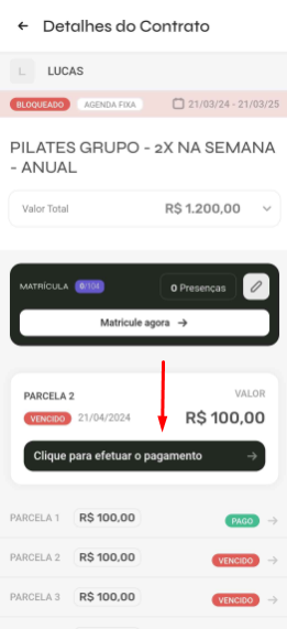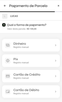 - Selecione o aluno que deseja realizar a baixa no pagamento.