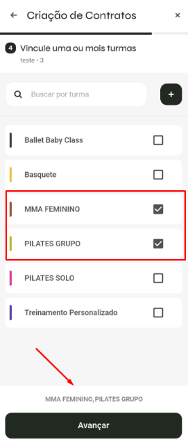 - Escolha as turmas que os alunos podem acessar ao adquirir esse contrato:
