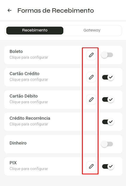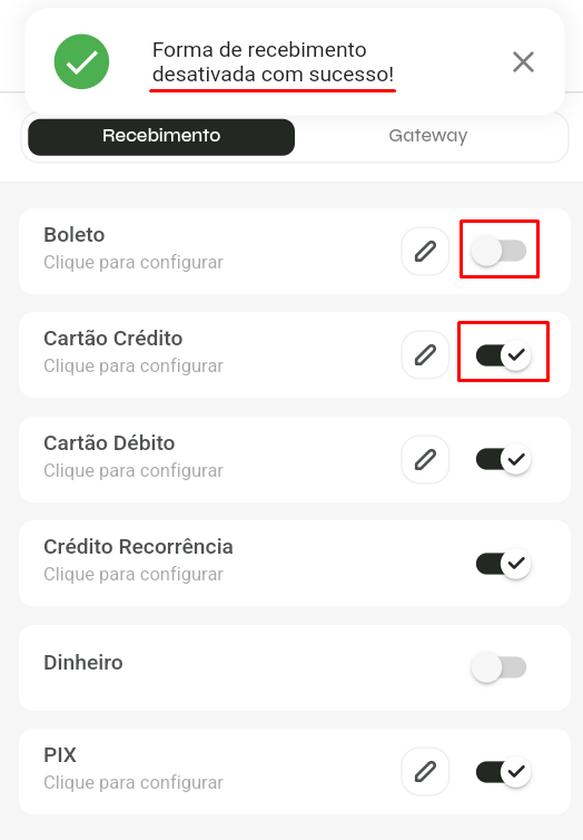 - É possível habilitar ou desabilitar uma forma de recebimento, (Clicando no ícone selecionado):