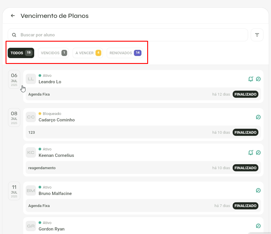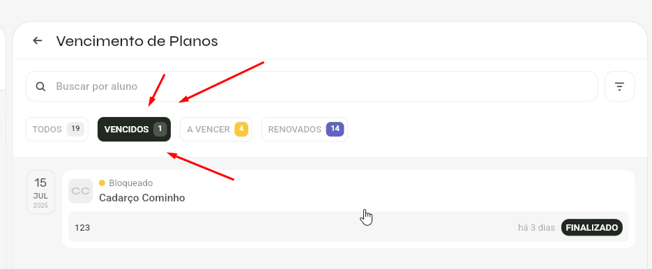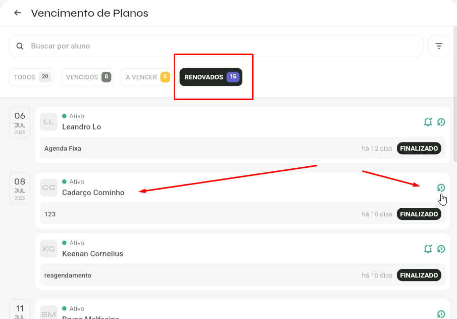 - O aluno deixa de constar na aba de vencidos e passa a estar presente na aba de Renovados.