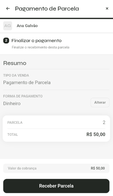 - Revise os detalhes e clique em "Receber Parcela"