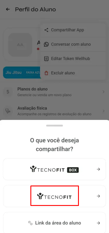 Selecione o aplicativo Tecnofit para compartilhar o link.