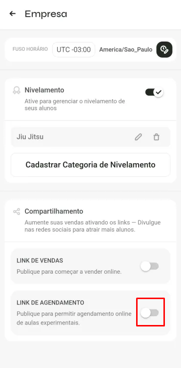 Encontre a opção Link de agendamento e ative-a (ligue o botão / toggle).
