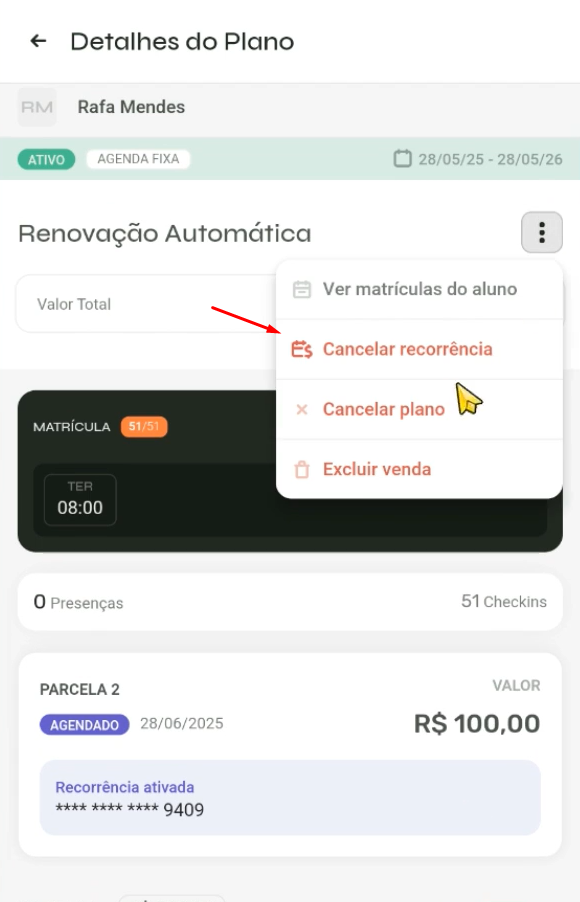 Se o aluno trocou de cartão de crédito ou precisa atualizar os dados de pagamento, é necessário cancelar a recorrência atual e ativá-la novamente com o novo cartão.