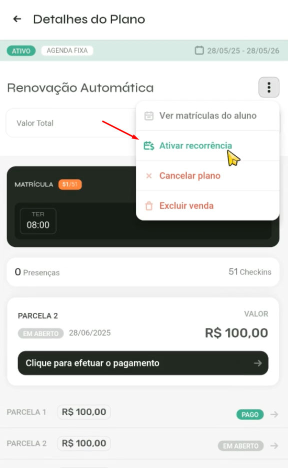 Clique novamente nos 3 pontinhos e selecione Ativar recorrência.
