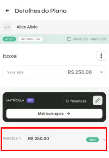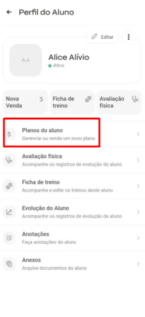 Dentro do perfil do aluno, toque na aba Planos do aluno.