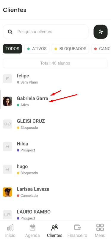 Na tela inicial do aplicativo, toque na aba Clientes.