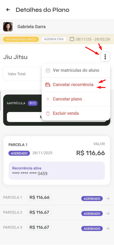 Essa ação é útil quando o aluno não continuará com o plano ou quando há necessidade de interromper as cobranças futuras no cartão.