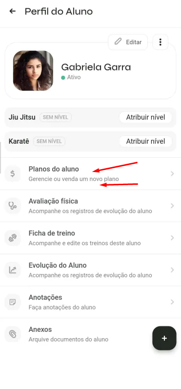 Dentro do perfil do aluno, clique em Planos do aluno.