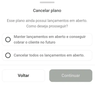 Manter lançamentos em aberto: o cliente continuará com as cobranças pendentes e poderá ser cobrado futuramente.
