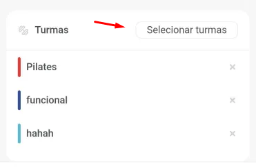 Clique em Selecionar turmas e marque as novas turmas ou modalidades que o contrato deve incluir.