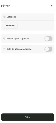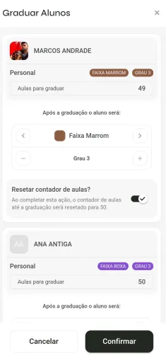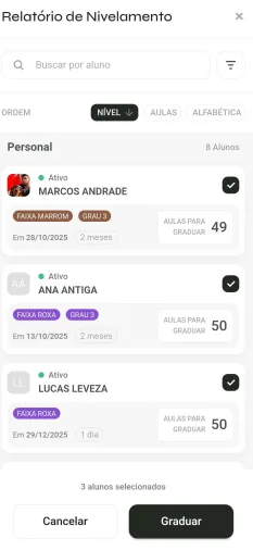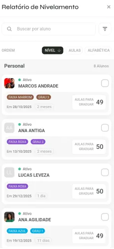 Com esse relatório, é possível visualizar o nível atual de cada aluno, acompanhar o progresso até a próxima graduação e realizar ações em lote de forma prática.